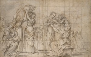 | Pen and brown ink, with brush and brown wash and traces of graphite, heightened with lead white (partially oxidized), on tan laid paper, laid down on cream laid card prepared with gold paint