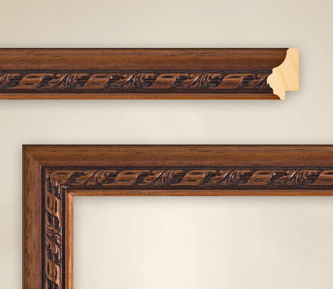 The designers have devised individual carvings for the Lucy painting frame. In the Antiko series, this real wood frame is presented in a warm medium brown, is 34 mm wide and 22 mm high. In dark brown, it begins with a very thin bar on the outer frame and is then immediately replaced by a wide, smooth and curved bar. Dark, fibrous elements have been incorporated here, so that the impression is created as if it were the grain of oak wood. The ornamental bar that follows is a fittingly rustic addition. The ornament bar slides into the room as a maximum elevation. The background of the decorative elements was chosen in dark brown, which also surrounds the strip above and below with a decorative strip. This ensemble offers a strong contrast to the ornaments themselves, which in turn are depicted in the medium brown of the entire Lucy frame. These decorative elements are divided into two types, each alternating in a diagonal arrangement. On the one hand you can see a floral work in the form of a tendril, on the other hand a rectangular structure that reminds of an eight. There are no limits to the viewer's imagination - they always have an effect on Lucy. |