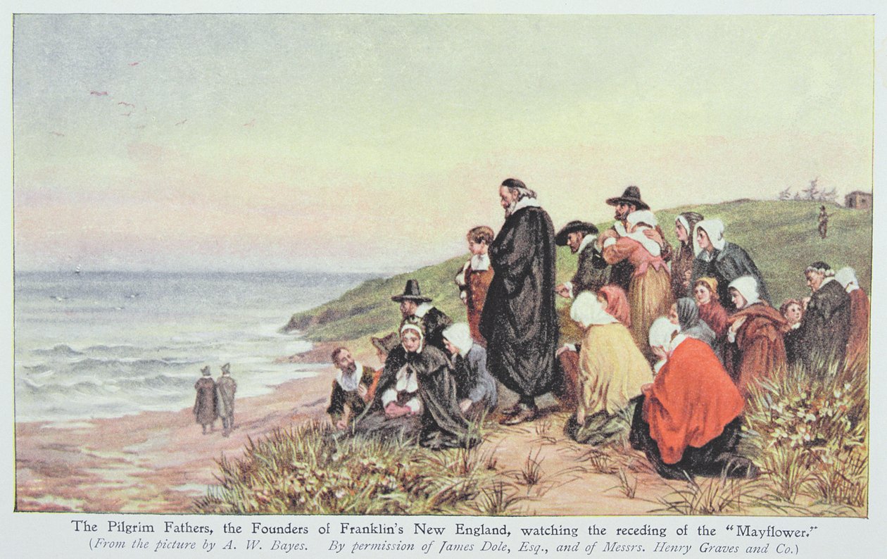 The Pilgrim Fathers, the Founders of Franklin's New England, watching the Receding of the 'Mayflower', illustration from 'Lives of Great Men Told by Great Men', edited by Richard Wilson, c.1920s(The Pilgrim Fathers, the Founders of Franklin's New England, watching the Receding of the 'Mayflower', illustration from 'Lives of Great Men Told by Great Men', edited by Richard Wilson, c.1920s (colo)Alfred Walter Bayes |