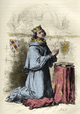 14th century · 19th century · colour · crown · france · europe · engraving · history · middle ages · portrait · prayer · king · royalty · kneeling · mzengraving · Private Collection / Bridgeman Images