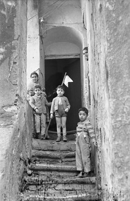 1950s · 20th century · stairs · woman · child · italy · europe · house · housing · poverty · population · calabria · society · black and white · photo · outside · mzphoto · · / Bridgeman Images