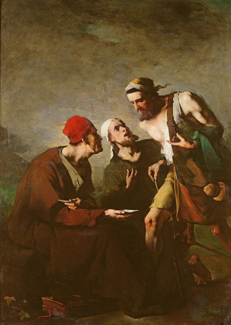 male · group · litigant · holding · oysters · pilgrim · pilgrims · story · tale · talking · conversing · dispute · shell · shells · traveller · travellers · Musee des Beaux-Arts, Caen, France / Bridgeman Images |