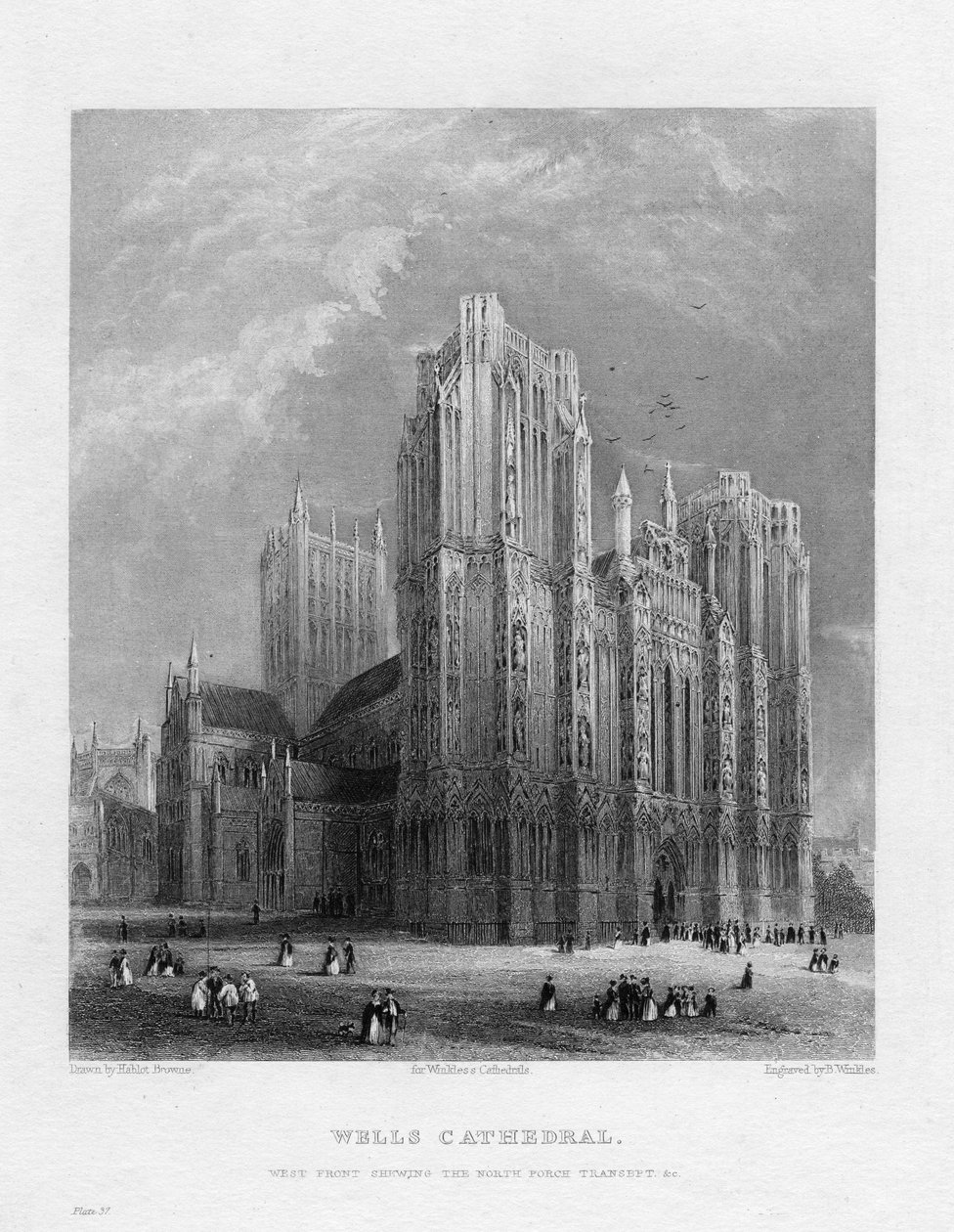 exterior · building · buildings · england · people · religious · architecture · country · religion · british · cathedral · english · church · medieval · christianity · gothic · location · century · wells · britain · facade · outside · somerset · monochrome · 19th century · black white · black and white · mediaeval · middle ages · wells cathedral · façade · nineteenth century · 12th century · church tower · engraving · hablot knight browne · browne · benjamin winkles · hablot knight · phiz · hablot browne · winkles · benjamin · winkles · b · The Print Collector/Heritage Images |