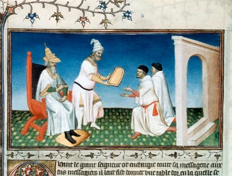 Kublai Khan giving Nicolo and Marco Polo safe conduct to Peking, with his golden seal to the Polos at Cambaluc in 1292, from 'Le Livre des Merveilles'(Ms Fr 2810 f.3v, Kublai Khan giving Nicolo and Marco Polo safe conduct to Peking, with his golden seal to the Polos at Cambaluc in 1292, from 'Le Livre des Merveilles', c.1410-12 (tempera on vellum))Boucicaut Master |