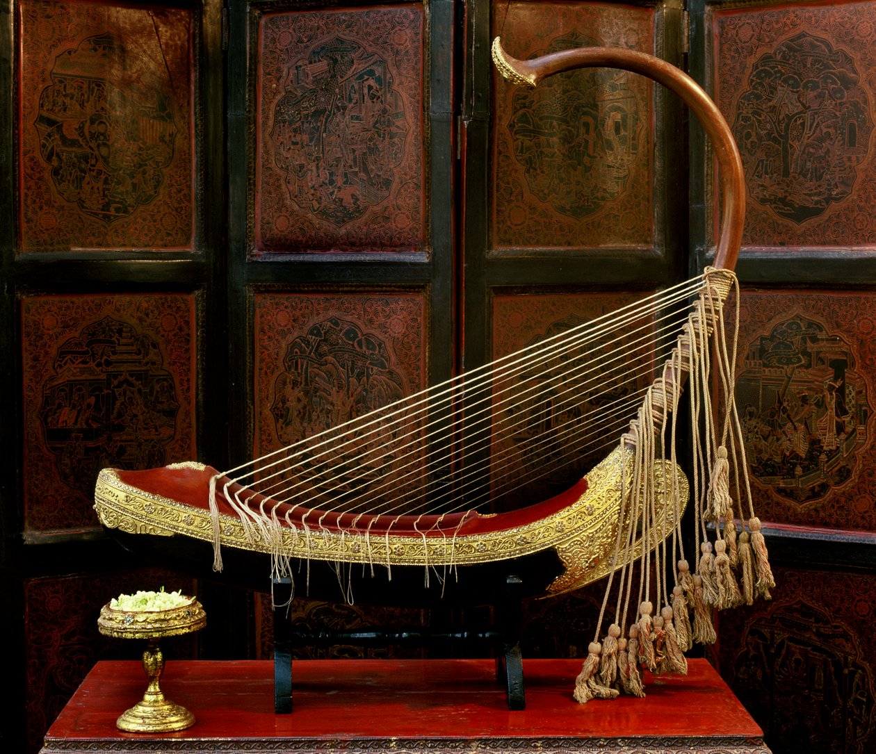 burma · myanmar · musical instrument · stringed · traditional · lyre · gilded · gold · gilt · screen · embossed leather · tassels · artefact · artifact · asian · Private Collection / Bridgeman Images |
