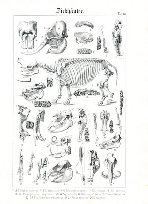 19th century · germany · europe · anatomy · animal · skull · skeleton · elephant · hippopotamus · natural history · many animals · rhino · zoology · black and white · lithograph · print · mzengraving · zoological plate · / Bridgeman Images