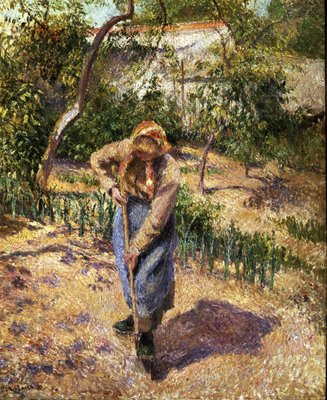 19th century · countryside · colour · woman · impressionism · art movement · peasant · painting · vegetable garden · apron · vegetation · headscarf · clothes · pissarro camille (1830-1903) · france · europe · painter · artist · outside · mzpainting · shovel · · / Bridgeman Images