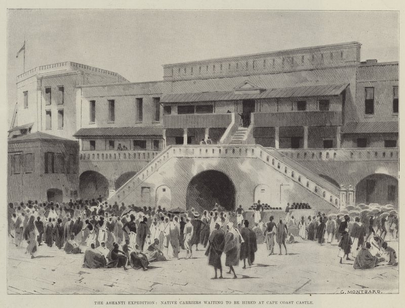 ashanti expedition · native carriers · waiting · hired · cape coast castle · ghana · street scenes · architecture · Private Collection / Bridgeman Images · / Look and Learn |