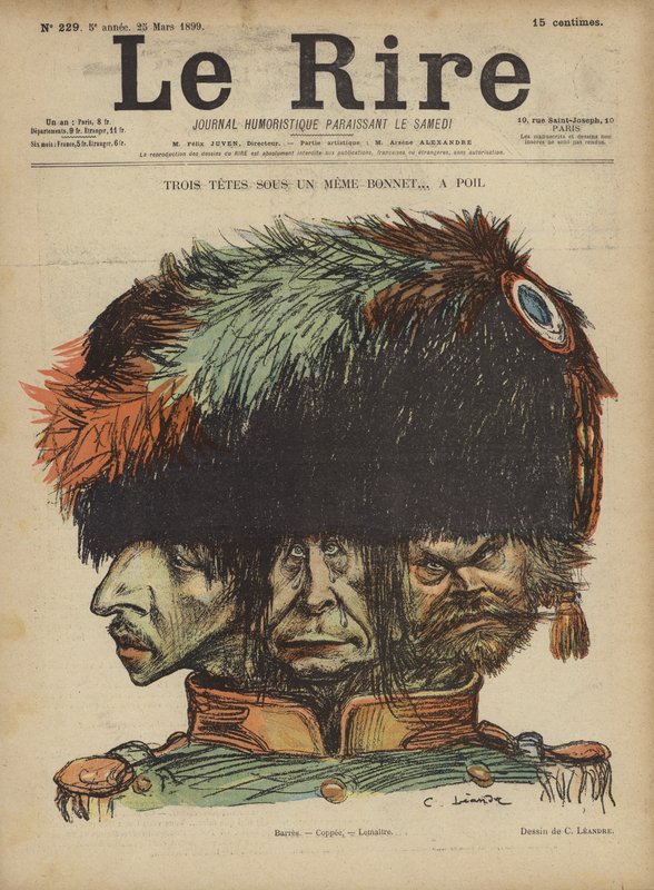 le rire · magazine · humour · humorous · comic · funny · amusing · satire · satirical · france · french · cartoon · cartoons · caricature · caricatures · social · three heads · barres · francois coppee · jules lemaitre · Private Collection / Bridgeman Images · / Look and Learn |