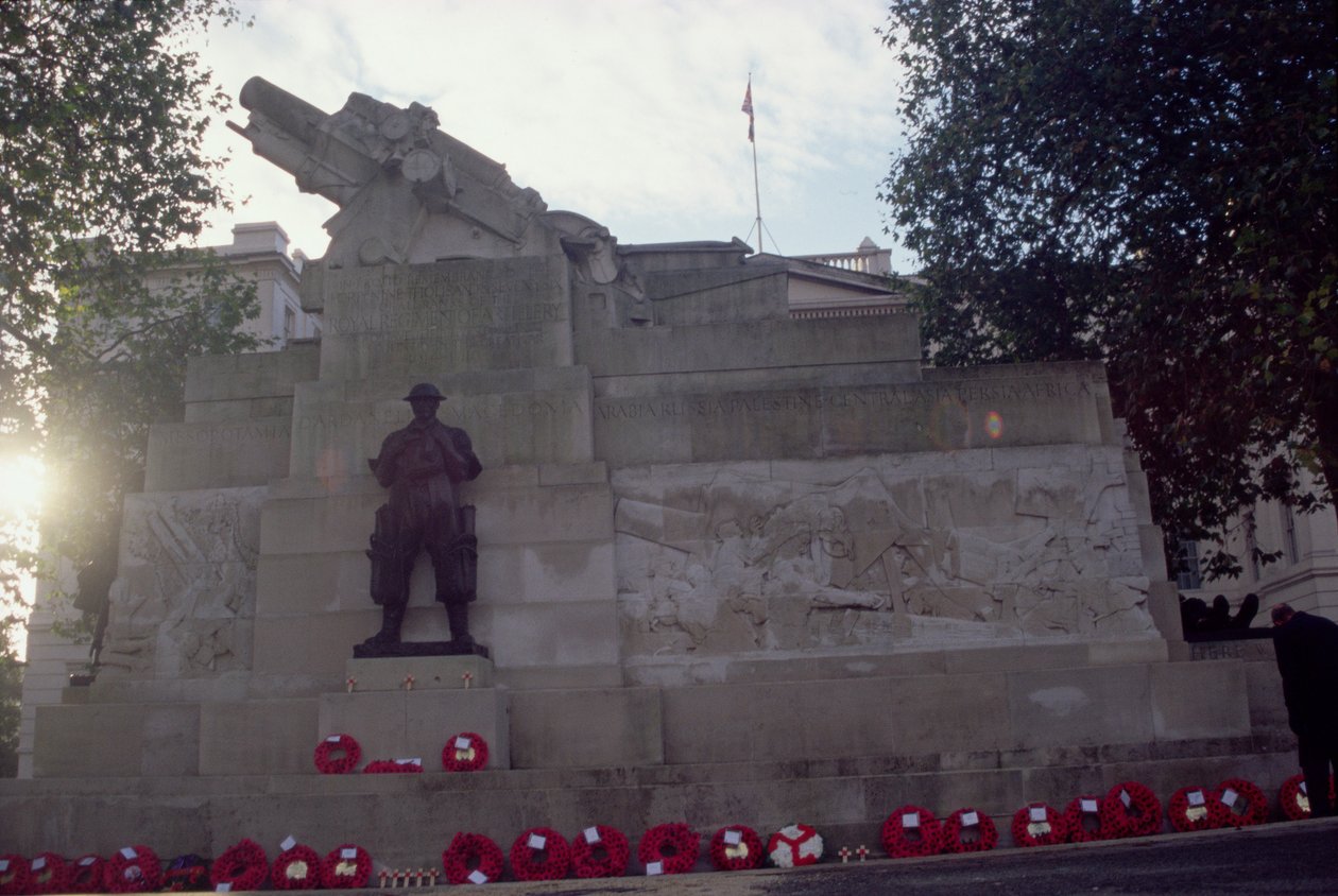 poppy wreath · world war i · soldier · uniform · relief · howitzer · cannon · remembrance · tribute · valour · defense · heroic · Hyde Park Corner, London, UK / Bridgeman Images |