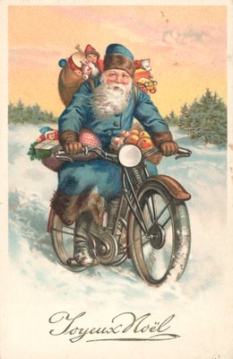 father christmas · cards · card · presents · gifts · motorbikes · motorcycles · christmas · greeting · postcards · snow · santa claus · danish christmas · denmark · Private Collection / Bridgeman Images