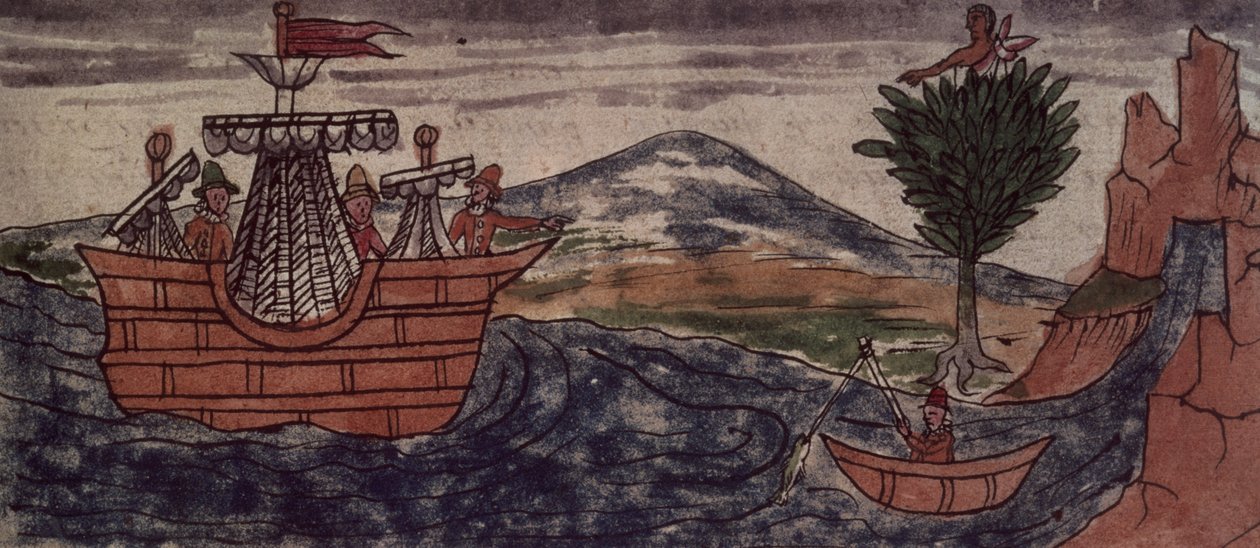 An Indian spy observes the arrival of a Spanish ship on the Mexican coast(Fol.197v An Indian spy observes the arrival of a Spanish ship on the Mexican coast, 1579 )Diego Duran |