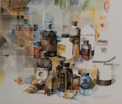 accessory · contemporary art · bottle · colour · italy · europe · still life · object · painting · nobody · watercolour · mzdrawing · varnish · contemporary artist · merlo donatella (1927-2014) · painter · artist · female artist · · Private Collection / Bridgeman Images