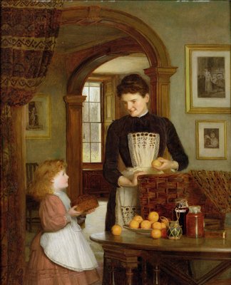 child · children · chidlren · chidren · children's children · childnre · chold · paediatrics · little child · little children · young child · children only · food · food supply · female · girl · fruit cake · bowl of · wicker · preserves · jam jar · preserve · domestic interior · victorian · oranges · maid · tommy · orange · painting · Mzpainting · Private Collection / Bridgeman Images