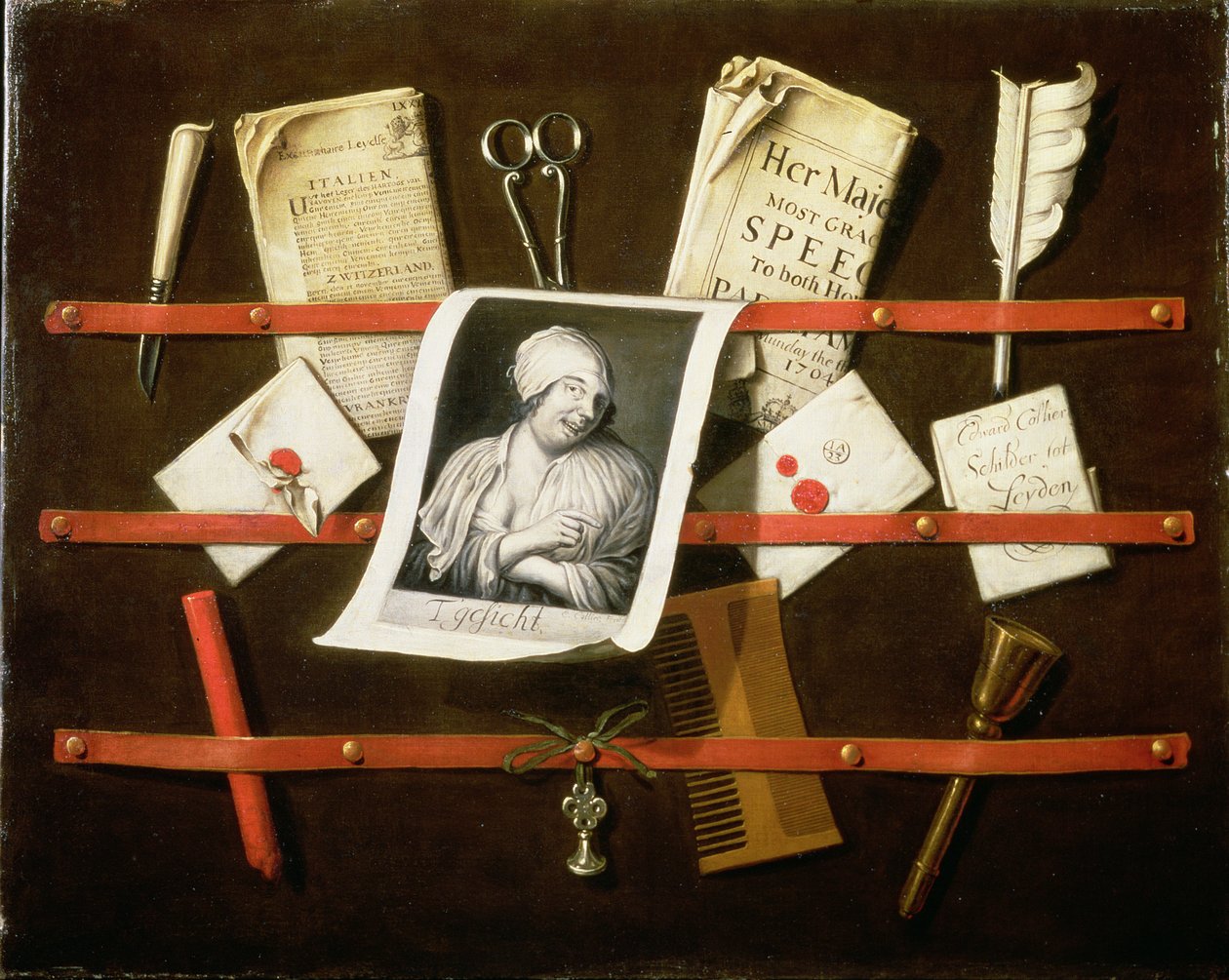 Trompe l'oeil Letter Rack with a Print of a Woman and a Parliamentary Speech of 1704(Trompe l'oeil letter rack with a print of a woman and a Parliamentary speech of 1704)Edwaert Colyer or Collier |