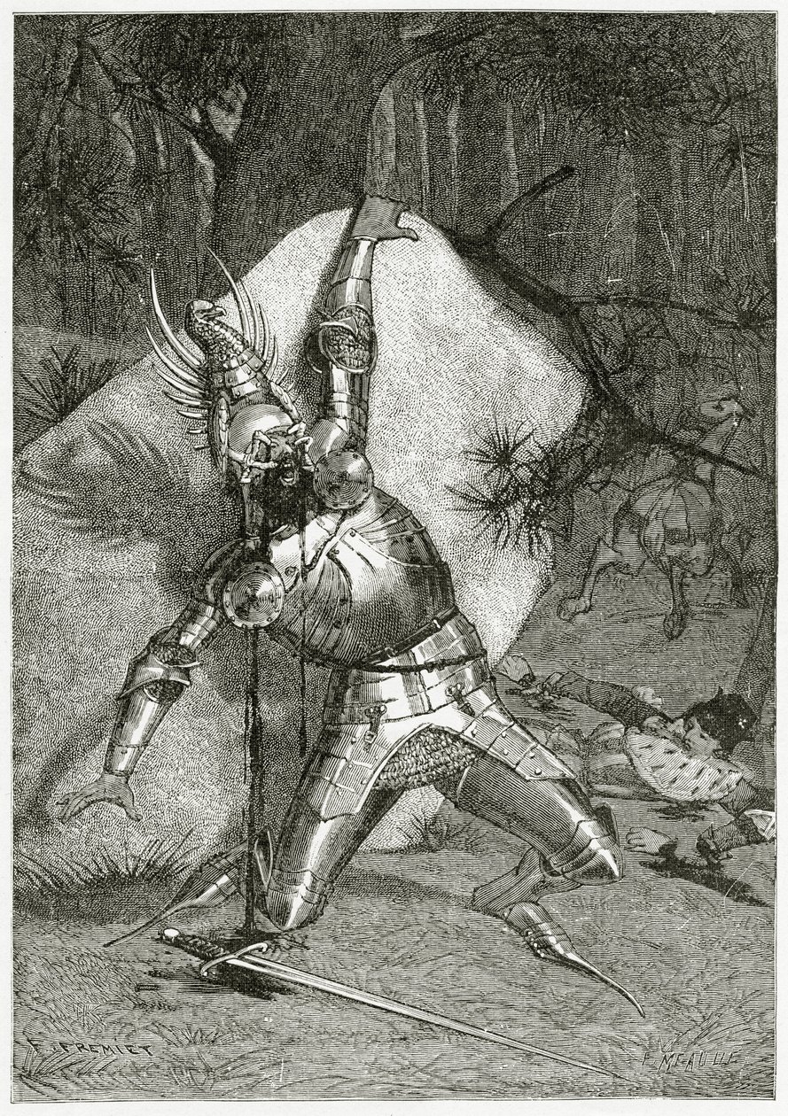 oeuvres · oeuvre · victor hugo · victor marie hugo · engraving · dessin · dessins · illustration · illustrations · depiction · depicting · 19th century · c19th · black and white · french · male · knight · blind · blinded · attack · attacked · bronze · eagle · bird · armour · blinding · story · peck · pecked · pecking · eyes · sight · blindness · punishment · punished · atonement · Private Collection / Bridgeman Images |