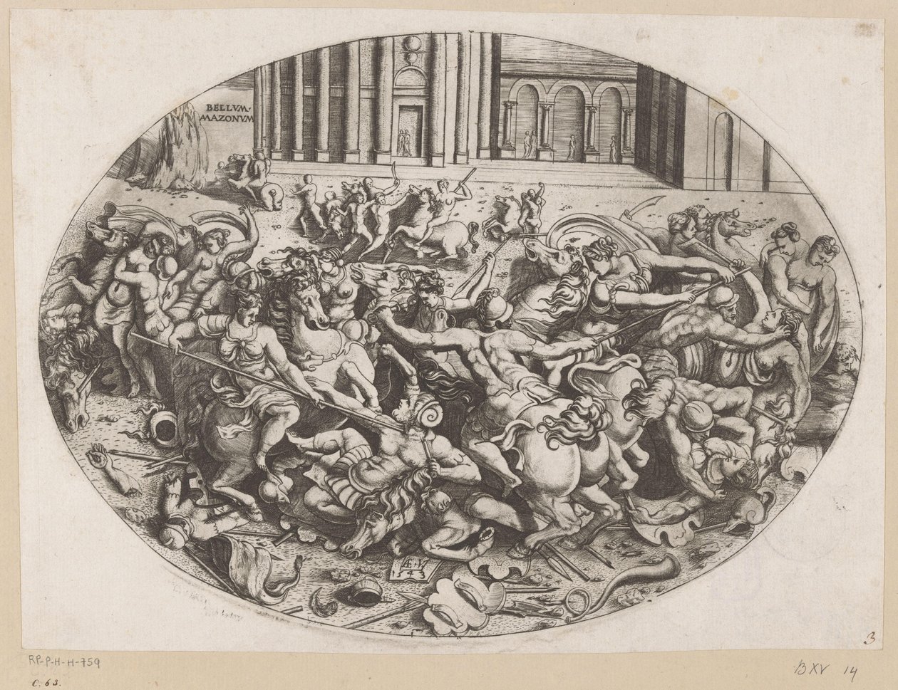 Battle of the Amazons(Amazonenslag Bellum Amazonum (title on object))Enea Vico(print maker),Rafaël(after design by),Giulio Romano(after design by) |