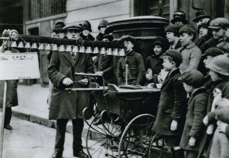 pleasures · london · entertainments · bells · played · streets · street · music · musical · poor · post · pram · Private Collection / Bridgeman Images · / Look and Learn