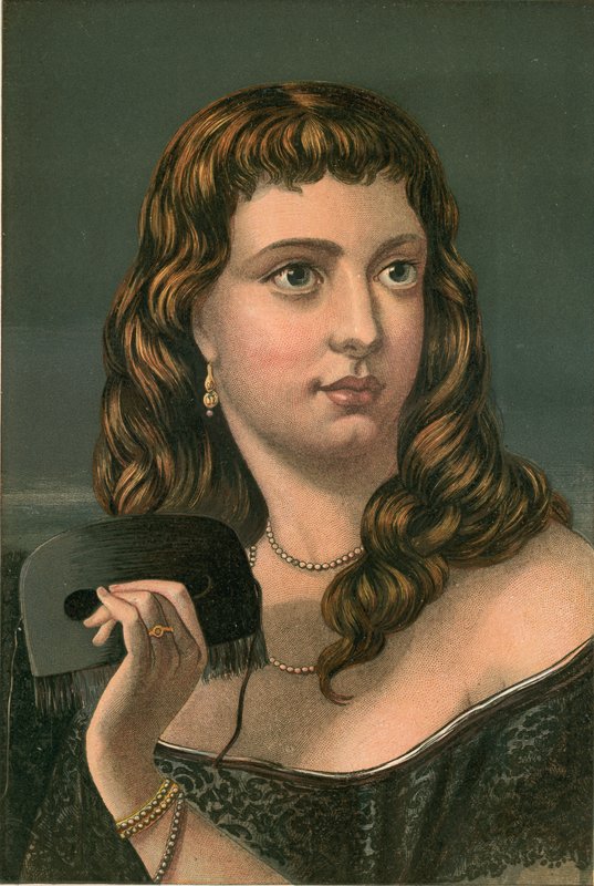 pilgrims progress · pilgrims progress · john bunyan · madam wanton · sex appeal · sexuality · mask · jewelry · jewels · dark clothes · black · brown eyes · wantonness · wicked woman · girl · liberated · loose woman · lax morals · wavy hair · seductress · seduction · seducer · mistress · Private Collection / Bridgeman Images · / Look and Learn |