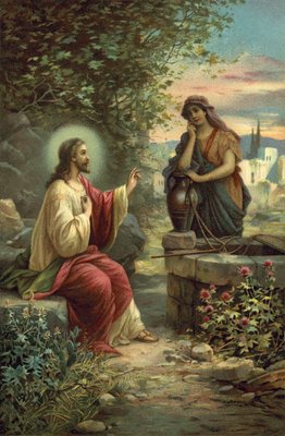 20th century · bible · drink · postcard · christianity · religion · conversation · colour · water · woman · jesus christ · bible (character) · well · print · story · mzprint · new testament · · Private Collection / Bridgeman Images · / Look and Learn