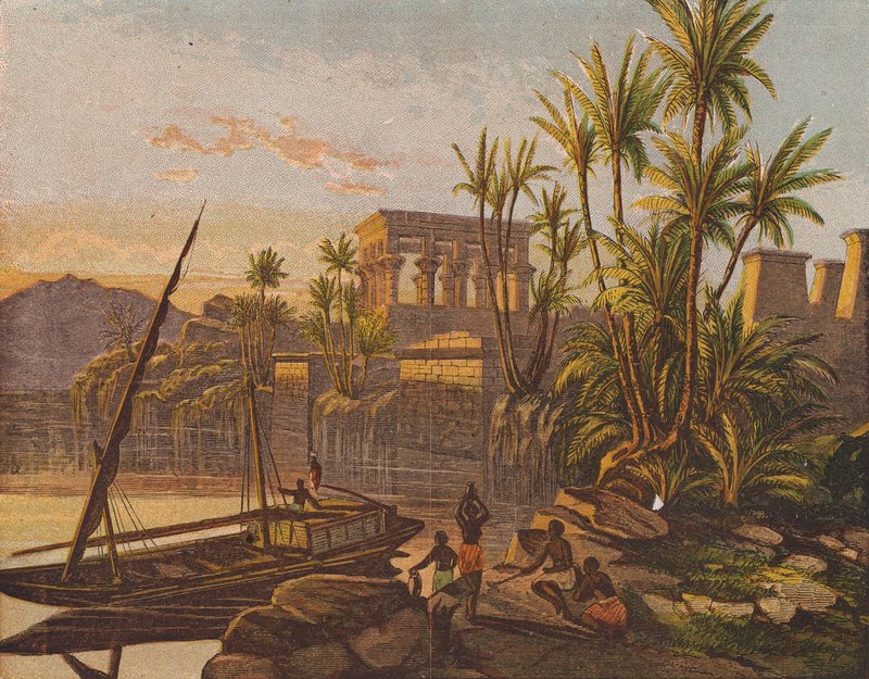 19th century · architecture · boat · transport · riverbank · colour · egypt · africa · north africa · river · history · island · building · nile · ruin · temple · print · mzprint · Private Collection / Bridgeman Images · / Look and Learn |
