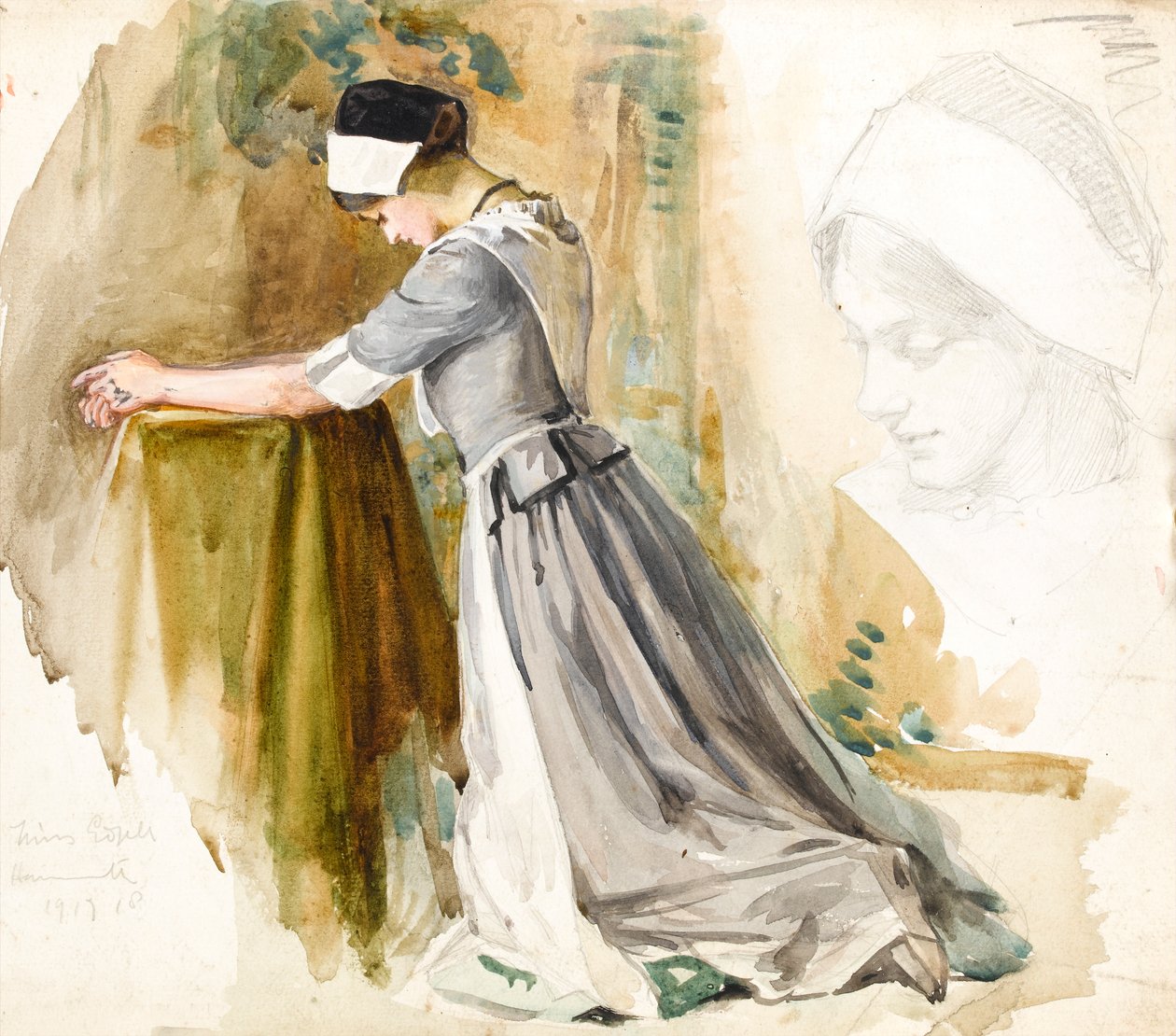 female · full length · portrait · kneeling · praying · religious · spiritual · christian · young · maid · servant · uniform · edwardian · grey dress · costume · apron · pinafore · interior · sketch · study · #117 · Private Collection / Bridgeman Images |