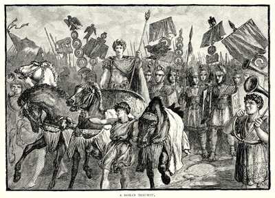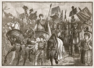 roman republic · procession · rite · triumphant · celebration · victory · victorious · male · parade · general · ancient rome · romans · soldiers · marching · march · chariot · horse drawn · horses · scipio africanus · cassells illustrated universal history · Private Collection / Bridgeman Images