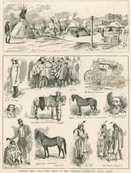 buffalo bills wild west show · american exhibition · earls court · london · entertainment · cowboys · indians · native american · horse · rifle · riding · teepee · stagecoach · william cody · graphic · 7 may 1887 · Private Collection / Bridgeman Images · / Look and Learn