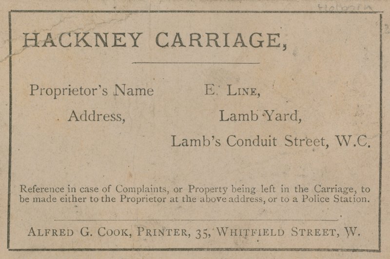 businesscards · hackney carriages · printed ephemera · cabs · transport · taxis · lambs conduit street · lambs yard · london · e line hackney carriage · Private Collection / Bridgeman Images · / Look and Learn |