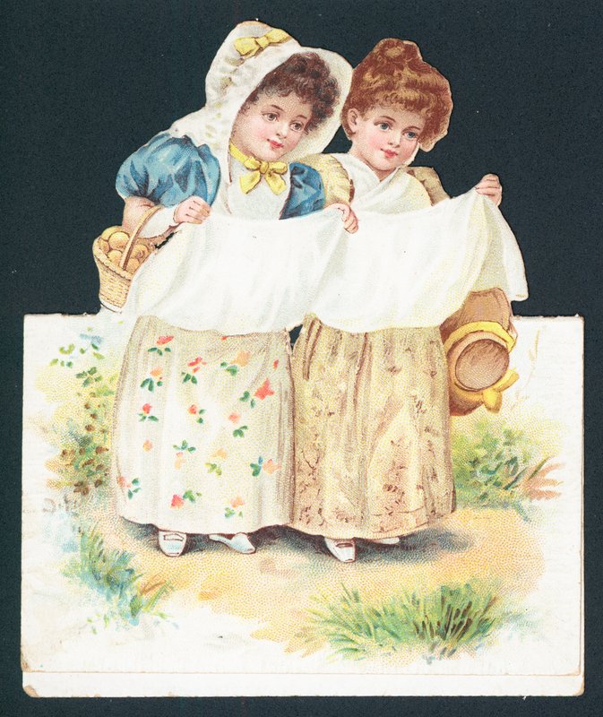 greetings · greeting · card · christmas · celebrate · happy christmas · merry christmas · festive · noel · xmas · seasons greetings · girls · friends · sisters · dress · bonnet · pinafore · apron · basket · Egg Basket · Private Collection / Bridgeman Images · / Look and Learn |