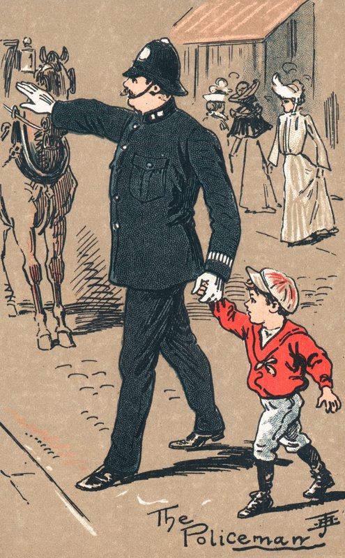 postcards · century · policemen · policing · horse-drawn · transport · street · scenes · children · boys · uniforms · the policeman · Private Collection / Bridgeman Images · / Look and Learn |