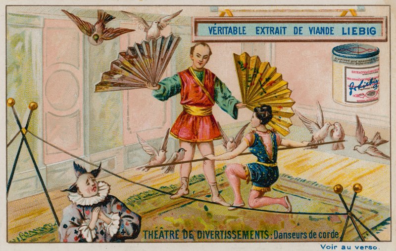 circus · troupe · theatre · divertissements · performers · costume · entertainments · tightrope dancers · chinese · fans · doves · balancing · acts · highwire · Private Collection / Bridgeman Images · / Look and Learn |