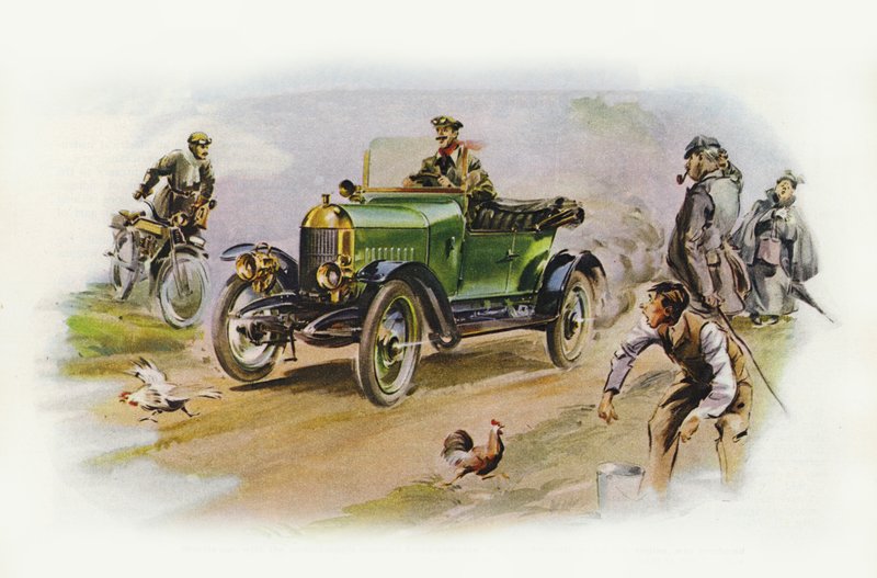 green · road · surprise · driving · automobile · chickens · Morris Oxford 10hp · / Bridgeman Images · / Look and Learn |