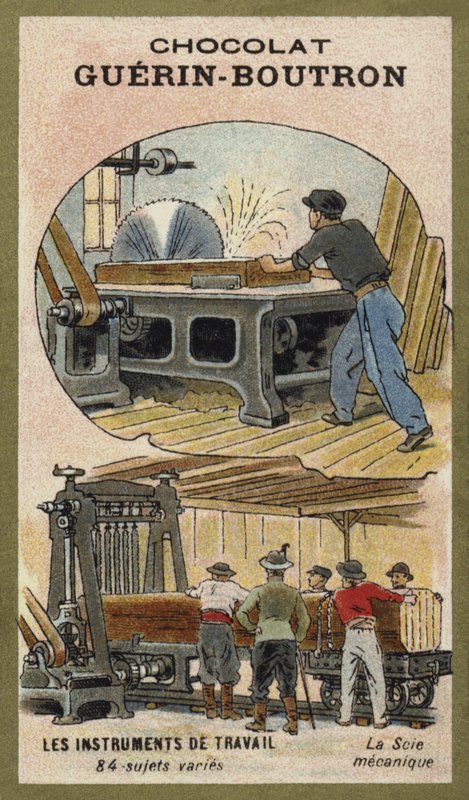 card · chocolat guerin-boutron · tool · trade · work · worker · working · occupation · sawing · wood · timber · sawyer · industry · industrial · mechanical · sawmill · Private Collection / Bridgeman Images · / Look and Learn |