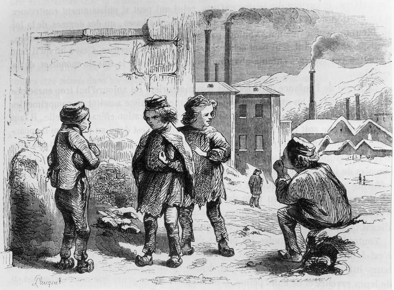 les enfants de fabrique · child labour · group · boys · work · worker · workers · labourer · labourers · exploitation · oppression · working · poor · industry · industrialisation · industrial revolution · chimney · smoke · Victorian · Bibliotheque des Arts Decoratifs, Paris, France / Bridgeman Images |