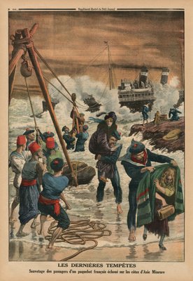 The Last Sea Storms, Rescuing the Passengers of a French Liner Lying on the Coast of Asia Minor, Back Cover Illustration from 'Le Petit Journal', Supplement Illustre, 11th January 1914(The last sea storms, rescuing the passengers of a French liner lying on the coast of Asia Minor, back cover illustration from 'Le Petit Journal', supplement illustre, 11th January 1914 )French School |