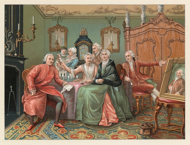 costume · dress · clothes · historical · history · national · fashion · racinet · england xviiith cent costume · portrait · group · conversation piece · drinking · elegance · Private Collection / Bridgeman Images · / Look and Learn |