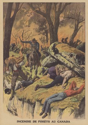 le petit journal · illustration · news story · fire in the forests of canada · forest fires · escape · bush fire · rocks · horse · danger · Private Collection / Bridgeman Images · / Look and Learn