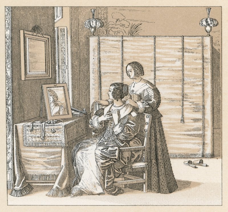 costume · dress · clothes · historical · history · national · fashion · racinet · europe xviith cent costume · european · dressing · table · maid · mirror · Private Collection / Bridgeman Images · / Look and Learn |