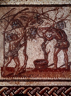 Galloromain Art: Autumn: Picking Apples and Harvesting(Galloromain art: autumn: picking apples and harvesting. Mosaic paving representing a rustic calendar from Saint Romain en Gal. End 2nd-beginning 3rd century. Saint Germain en Laye, Museum of Antiquites)Gallo-Roman Gallo-Roman |