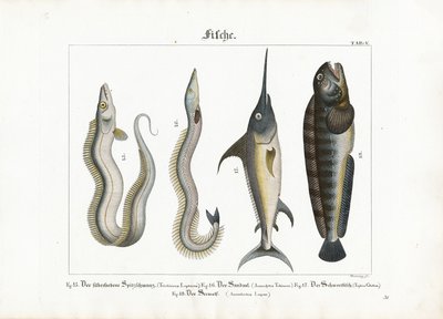 Marine Fishes: Cutlassfish, Sand Eel, Swordfish and Wolffish by Georg Bretzing. Available as an art print on canvas, photo paper, watercolor board, uncoated paper or Japanese paper.