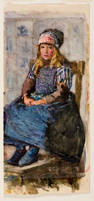 blue · female · people · childhood · child · children · girl · girls · interior · sitting · clothes · british · headdress · color · dress · hair · chair · victorian · fair · britain · inside · blonde · skirt · furniture · concept · headscarf · seated · looking at camera · one person · posture · hands clasped · headgear · colour · realism · pinafore · indoors · direct gaze · watercolour · portrait · george clausen · clausen · george · sir george clausen · national museum of wales · marianina · ©National Museum of Wales/Heritage Images