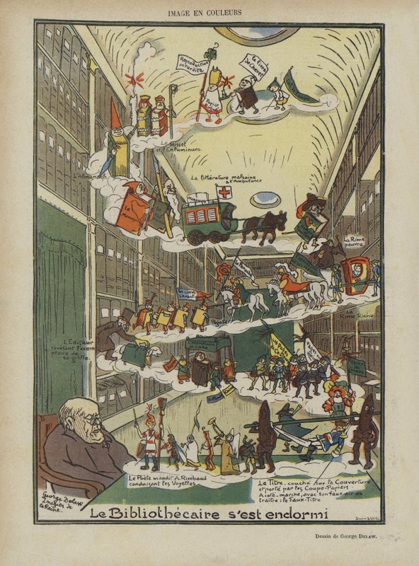 le rire · magazine · humour · humorous · comic · funny · amusing · satire · satirical · france · french · cartoon · cartoons · caricature · caricatures · social · library · librarian · dreams · dreaming · asleep · sleeping · procession · books · bookshelves · Private Collection / Bridgeman Images · / Look and Learn |