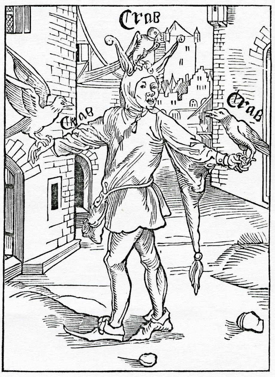 alexander · barclay · english · translation · sebastian · brandt · brandts · ship · fools · narrenschiff · woodcut · illustration · vices · vice · satire · them · that · prolonge · amende · themselfe · prolong · amend · themselves · fool · crows · crow · perching · hands · head · idle · idling · putting · things · c16th · sin · sinner · jester · Private Collection / Bridgeman Images |