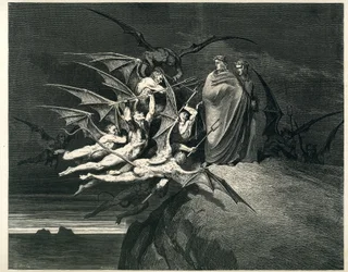(The Divine Comedy (La Divina Commedia, La Divine Comedie), Inferno, Canto 21: The demons threaten Virgil - by Dante Alighieri (1265-1321) - Illustration by Gustave Dore (1832-1883))