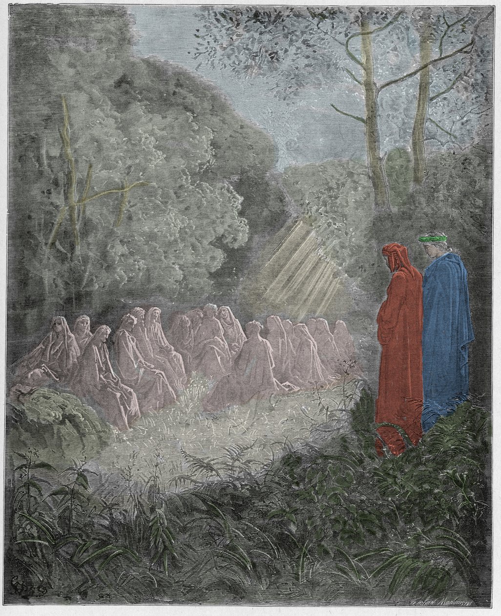 Purgatorio, Canto 7: The spirits singing Salve Regina in the dell (illustration from The Divine Comedy)(Purgatorio, Canto 7 : The spirits singing Salve Regina in the dell, illustration from The Divine Comedy by Dante Alighieri, 1885 (digitally coloured engraving))Gustave after Dore |