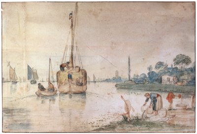 transport · transportation · river · water · female · women · woman · people · sailing boat · boat · boats · arts · painting · country · geography · holland · dutch · color · colour · cargo · location · sailboat · century · barge · drawing · lady · riverbank · transporting · 17th century · water transport · seventeenth century · geographical feature · sailing barge · watercolour · hendrick avercamp · avercamp · hendrick · dutch golden age · Fine Art Images/Heritage Images