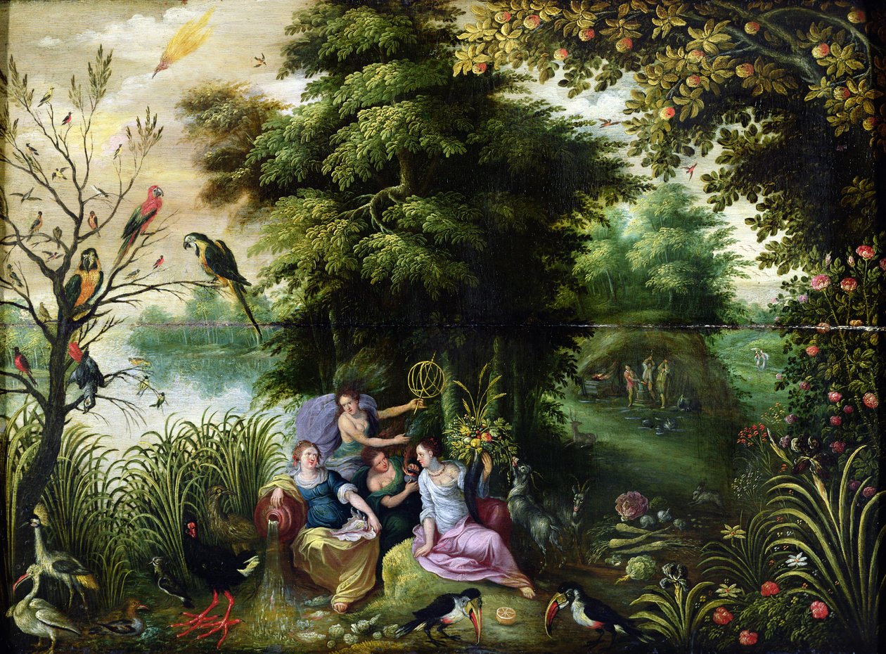 element · armillary sphere · pelican · nature · parrot · rural · countryside · lake · water · stork · peacock · fire · goat · earth · figurative · female · women · bird · birds · goddess · vulcan · aeneas armour · overturned urn · fa00320 · Les Quatre Elements · Musee des Beaux-Arts, Valenciennes, France / Bridgeman Images