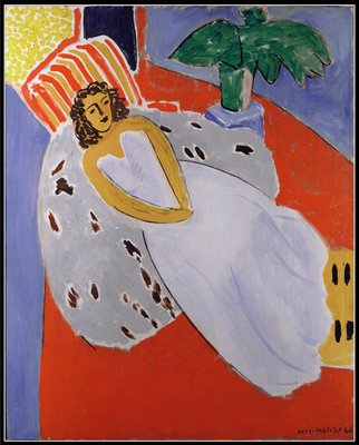 1940s · 20th century · white · colour · armchair · furniture · woman · youth · painting · plant · bird's eye view · blanket · oil painting · reclining · matisse henri (1869-1954) · artist · france · europe · painter · dress · clothes · mzpainting · interior · modern art · · Musee des Beaux-Arts, Lyon, France / Bridgeman Images