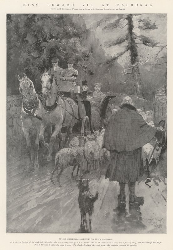king edward vii · balmoral · old shepherd · greeting · their majesties · hrh prince edward of cornwall · york · royalty · edward vii · sheep · horse · drawn · transport · scotland · Private Collection / Bridgeman Images · / Look and Learn |